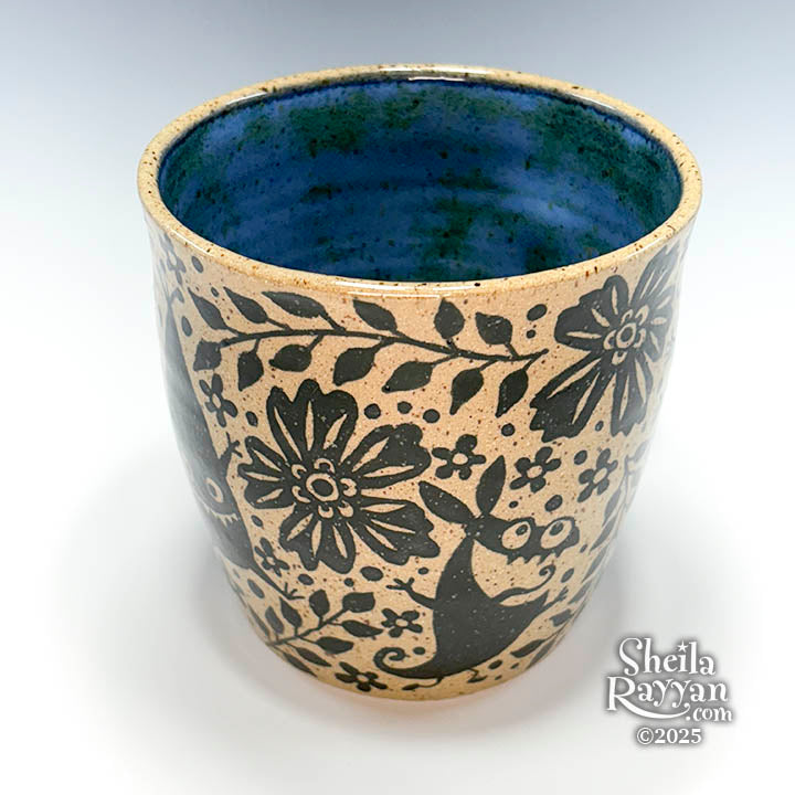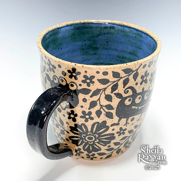 It is a one-of-a-kind handmade ceramic mug, "thrown" on the pottery wheel and then hand painted on the outside with underglaze colors. The outside is coated with a clear gloss glaze. Inside of the mug is medium blue glaze. The clay is a beautiful earthy stoneware tan color with black/brown specks. High-fired in a ceramic kiln, it is food, dishwasher, and microwave safe. All glazes are lead-free.