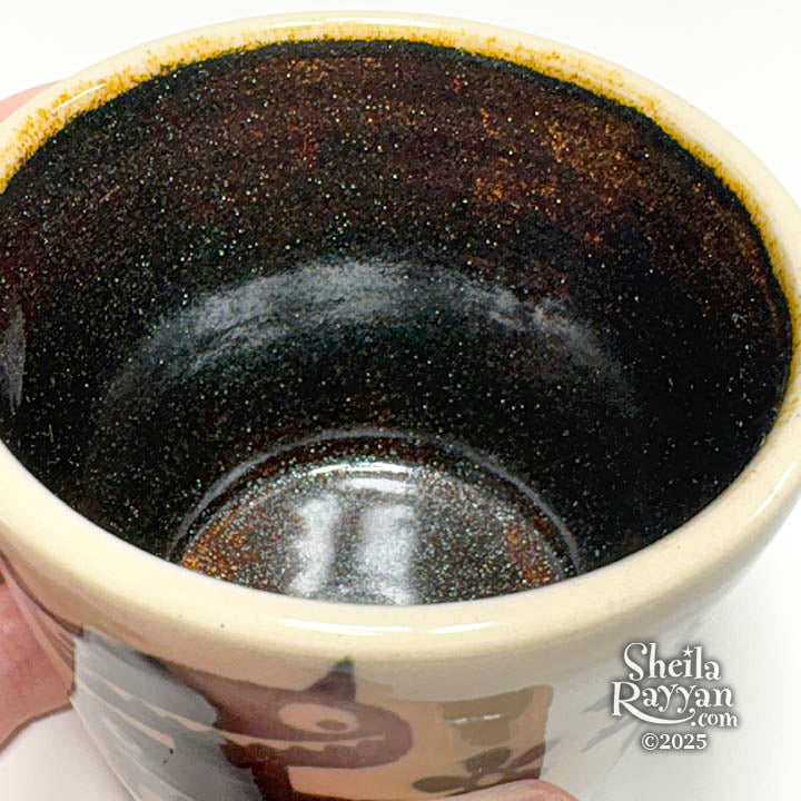 It is a one-of-a-kind handmade ceramic cup, "thrown" on the pottery wheel and then hand painted on the outside with underglaze colors. The outside is coated with clear gloss glaze. Inside of the cup is cosmic tea sparkle glaze. The clay is a white stoneware. High-fired in a ceramic kiln, it is food, dishwasher, and microwave safe. All glazes are lead-free.
