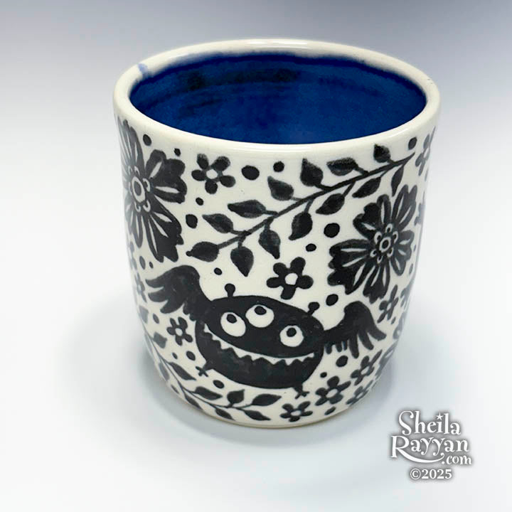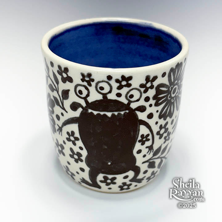 This handmade ceramic cup features silly monsters cavorting amongst garden flowers. It holds up to 8 ounces (1 cup) of your favorite beverages, making it an ideal companion for coffee, tea, wine or?... Perfect for adding a bit of whimsy to your day.