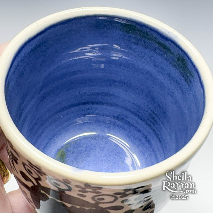 It is a one-of-a-kind handmade ceramic cup, "thrown" on the pottery wheel and then hand painted on the outside with underglaze colors. The outside is coated with clear gloss glaze. Inside of the cup is medium blue glaze. The clay is a white stoneware. High-fired in a ceramic kiln, it is food, dishwasher, and microwave safe. All glazes are lead-free.
